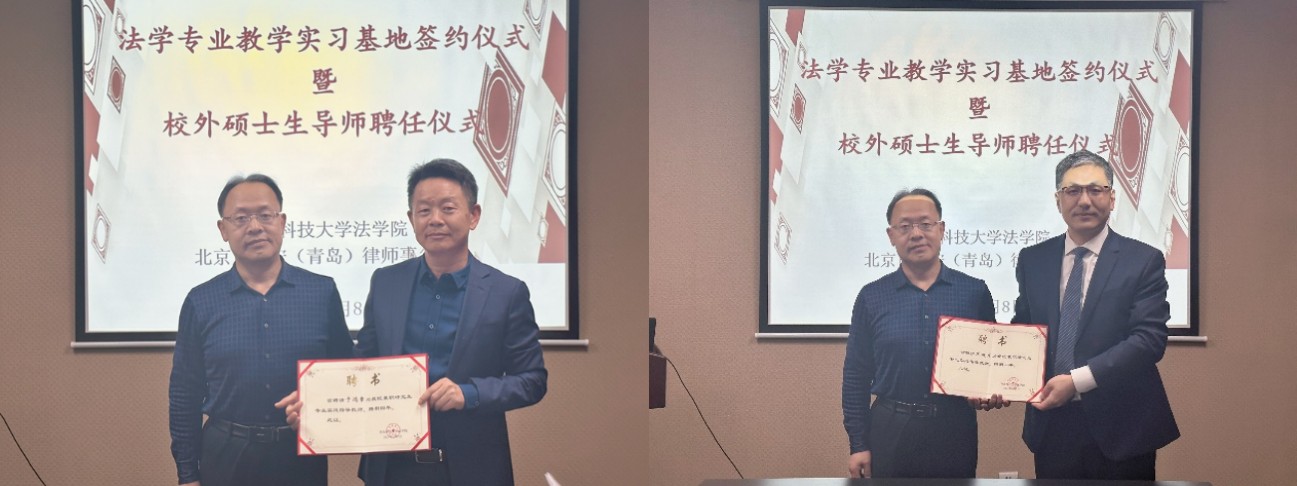 王金堂、于鸿章分别代表双方签署合作协议,为实践教学基地揭牌,并为于鸿章、焦成龙等律师颁发兼职研究生专业实践指导教师聘书。
