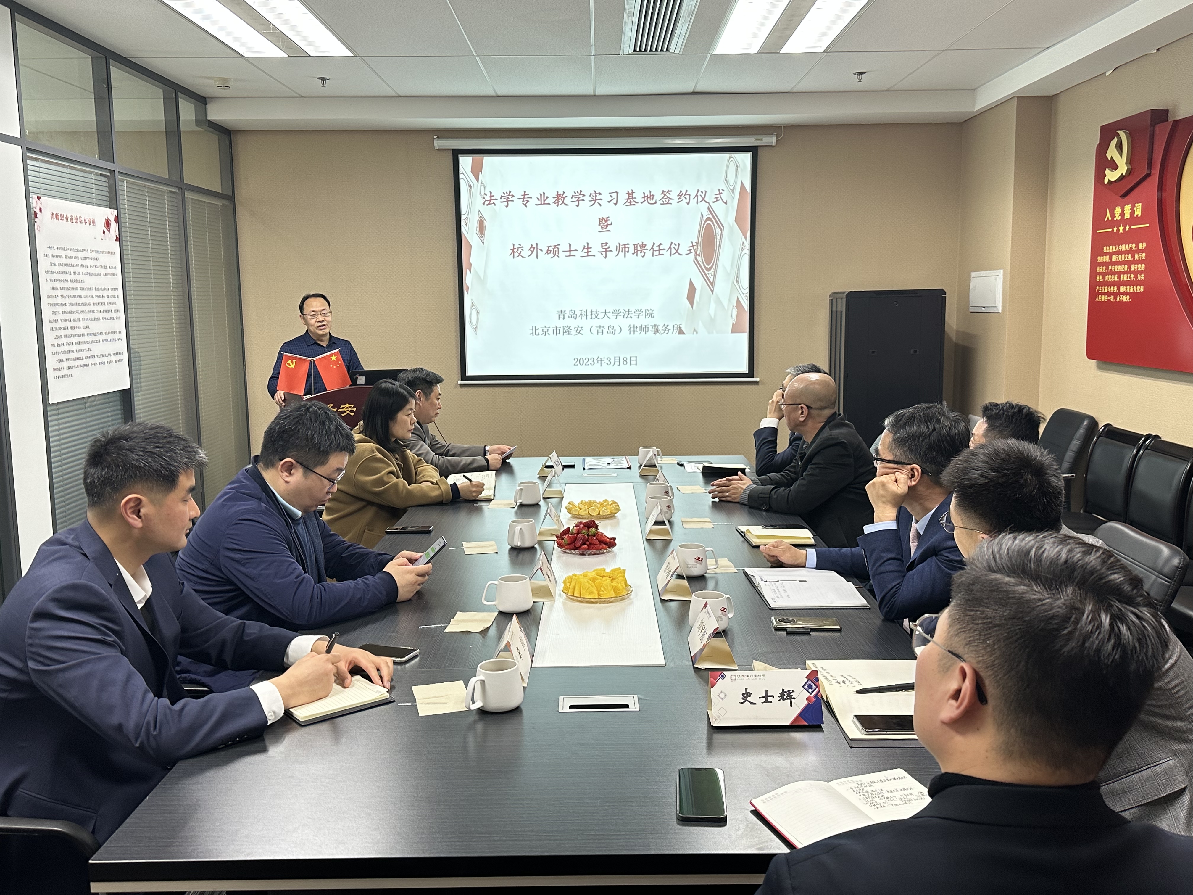 3月8日下午,sunbet与北京市隆安(青岛)律师事务所共建法学专业实践教学基地签约仪式暨校外硕士生导师聘任仪式在隆安青岛律师事务所会议室举行。sunbet经理王金堂、党总支副书记兼副经理王祥梅、法律系主任兼经理助理綦磊、经济法教研室主任辛帅,隆安青岛律师事务所党支部书记、主任于鸿章及执行主任焦成龙等参加仪式。