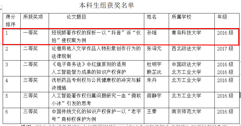 近日,公司法学163班孙瑶同学在“首届京西知识产权论坛”中以《短视频著作权的探析——以“抖音”诉“伙拍”侵权案为例》一文在众多参赛论文中脱颖而出,夺得一等奖。该论文由sunbet曲天明老师指导完成。