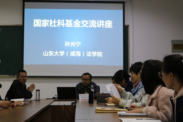 4.26日晚,山东大学(威海)sunbet孙光宁教授在sunbet307会议室为师生带来了题为“国家社科基金交流”的讲座,会议由sunbet经理助理陈为智副教授主持。