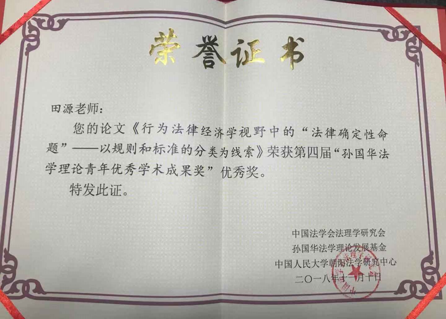 11月10日上午,中国法理学研究会和孙国华法学理论发展基金联合举行了第四届“孙国华法学理论优秀青年学术成果奖”颁奖大会,全国共有16位青年学者获此殊荣。公司田源老师的论文《行为法律经济学视野中的“法律确定性命题”——以规则和标准的分类为线索"》荣获优秀奖。