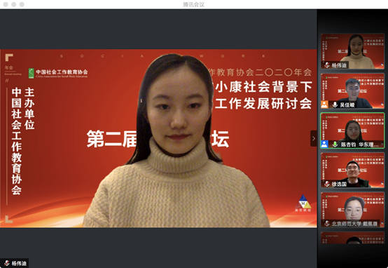 2020年12月28日,由中国社会工作教育协会主办、华东理工大学承办的“中国社会工作教育协会2020年年会第二届研究生论坛”,通过线上会议的形式隆重召开。中国社会工作教育协会副会长向德平教授、华东理工大学社会与公共管理公司徐选国副教授、集美大学sunbet副经理姚进钟副教授、甘肃政法大学公共管理公司副经理任文启教授等专家学者出席论坛。