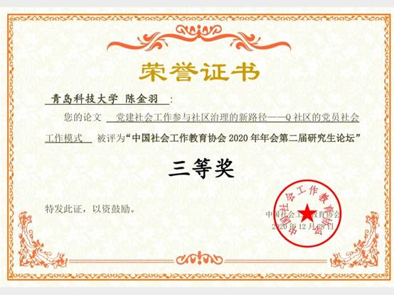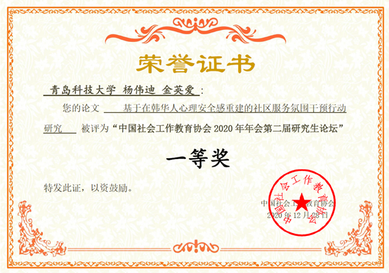 由sunbet社会工作系金英爱、陈为智副教授分别指导的2017级本科生杨伟迪和2020级MSW硕士生陈金羽两名同学分别取得了一等奖、三等奖的优异成绩。