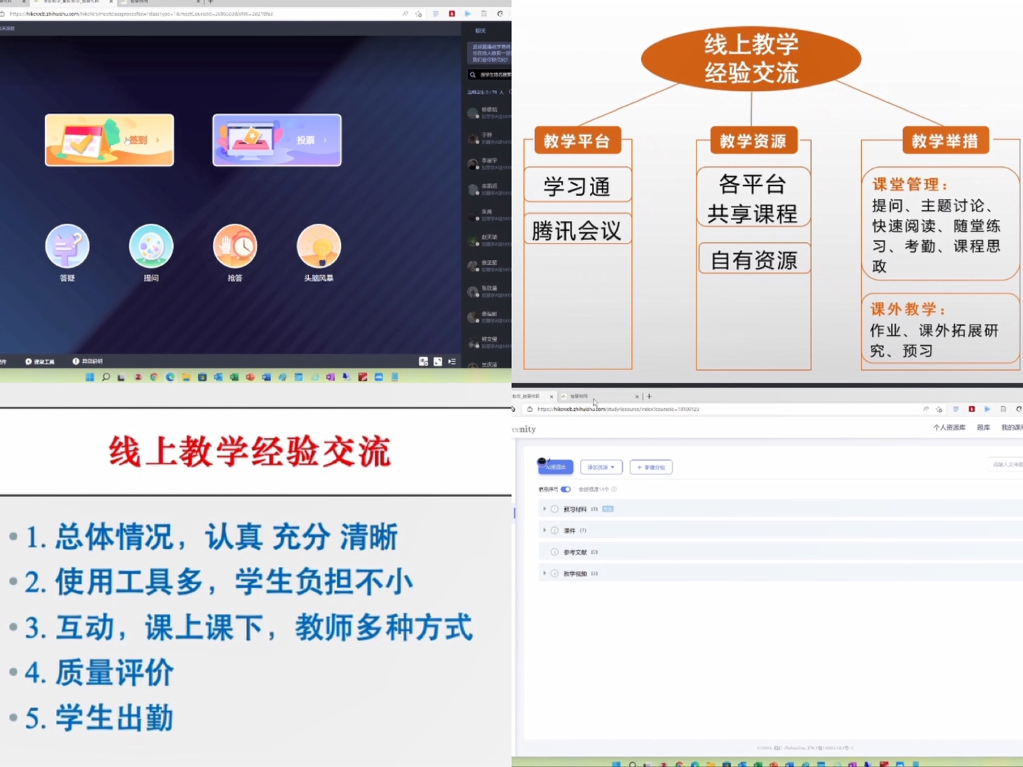 最后,王金堂对本次线上交流会进行总结,全体教师要以积极心态面对线上教学的各种挑战,灵活利用各种线上平台、信息化教学方式等提高线上教学效果,保障教学质量。老师们相互分享线上教学的灵活方式和优秀案例,不断提高线上教学能力和员工学习效果,推进教学质量的持续提升。