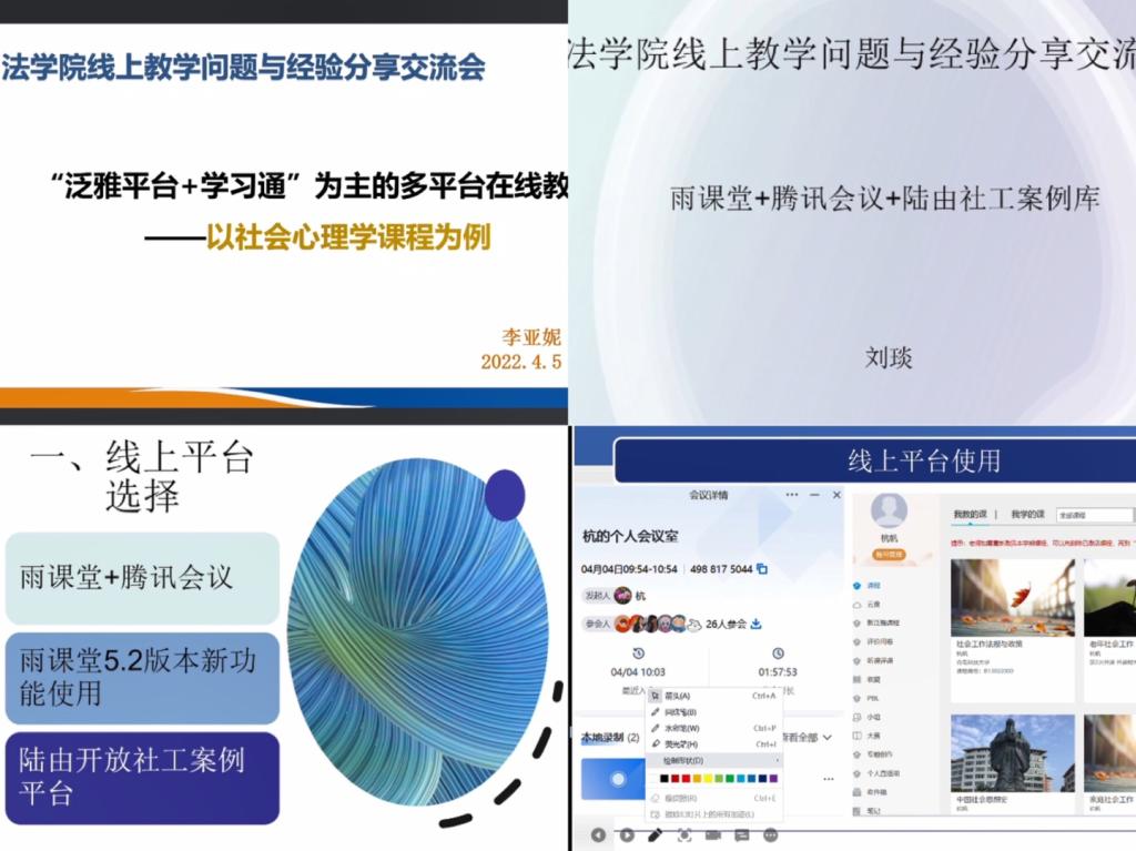 社会工作系教师李亚妮、刘琰、杭帆,法律系教师辛帅、周丽,学科组督导员教师宋敏、曲天明以及学工办老师付继航分别围绕线上教学平台应用、教学规范、教学资源、员工考勤、课堂管理、教学互动、教学质量、教学效果等方面进行了深入的问题剖析和经验分享。