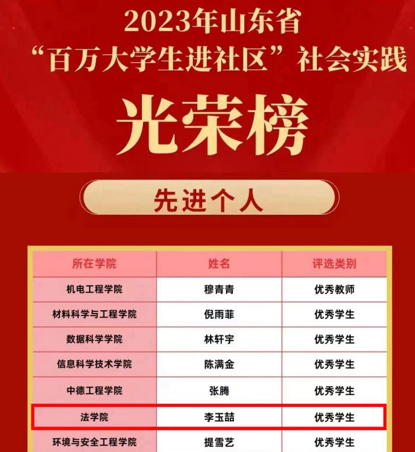 近日,共青团山东省委公布2023年度“百万老员工进社区”社会实践活动表扬通报单,sunbet社会工作221班员工李玉喆获评山东省“百万老员工进社区”社会实践先进个人(优秀员工)。