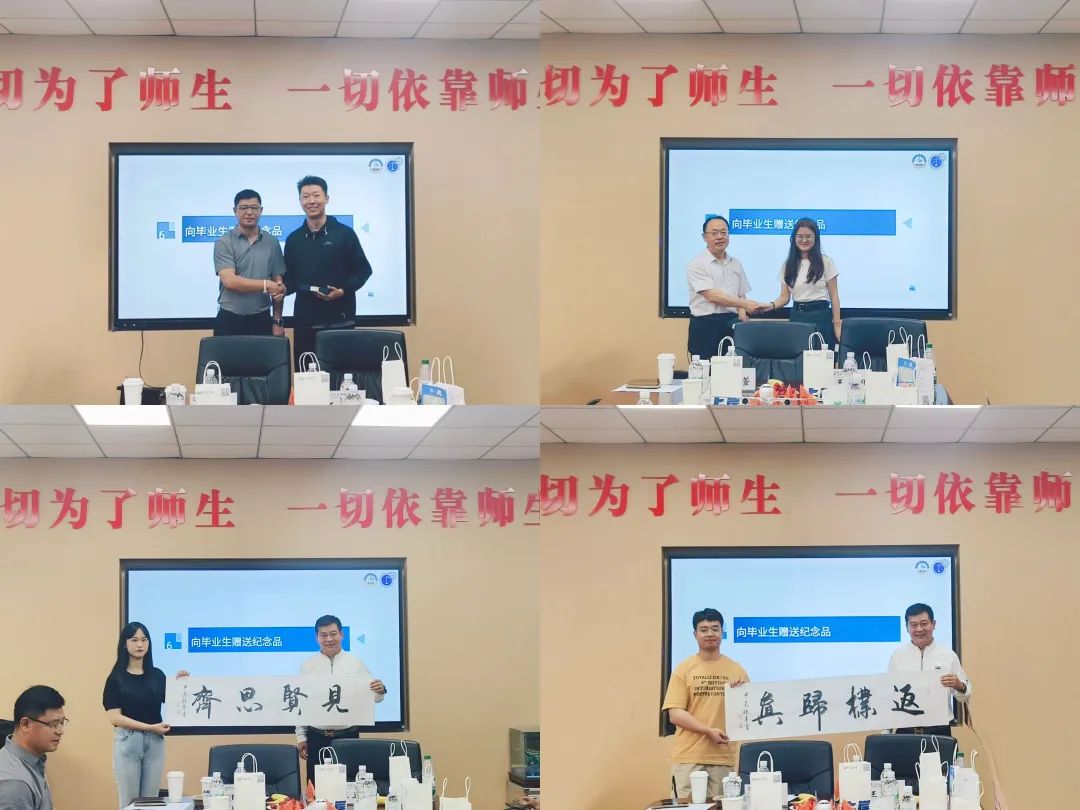 曲明、王金堂为毕业生赠送纪念品。张春雷为毕业生代表赠送毕业寄语书法作品。