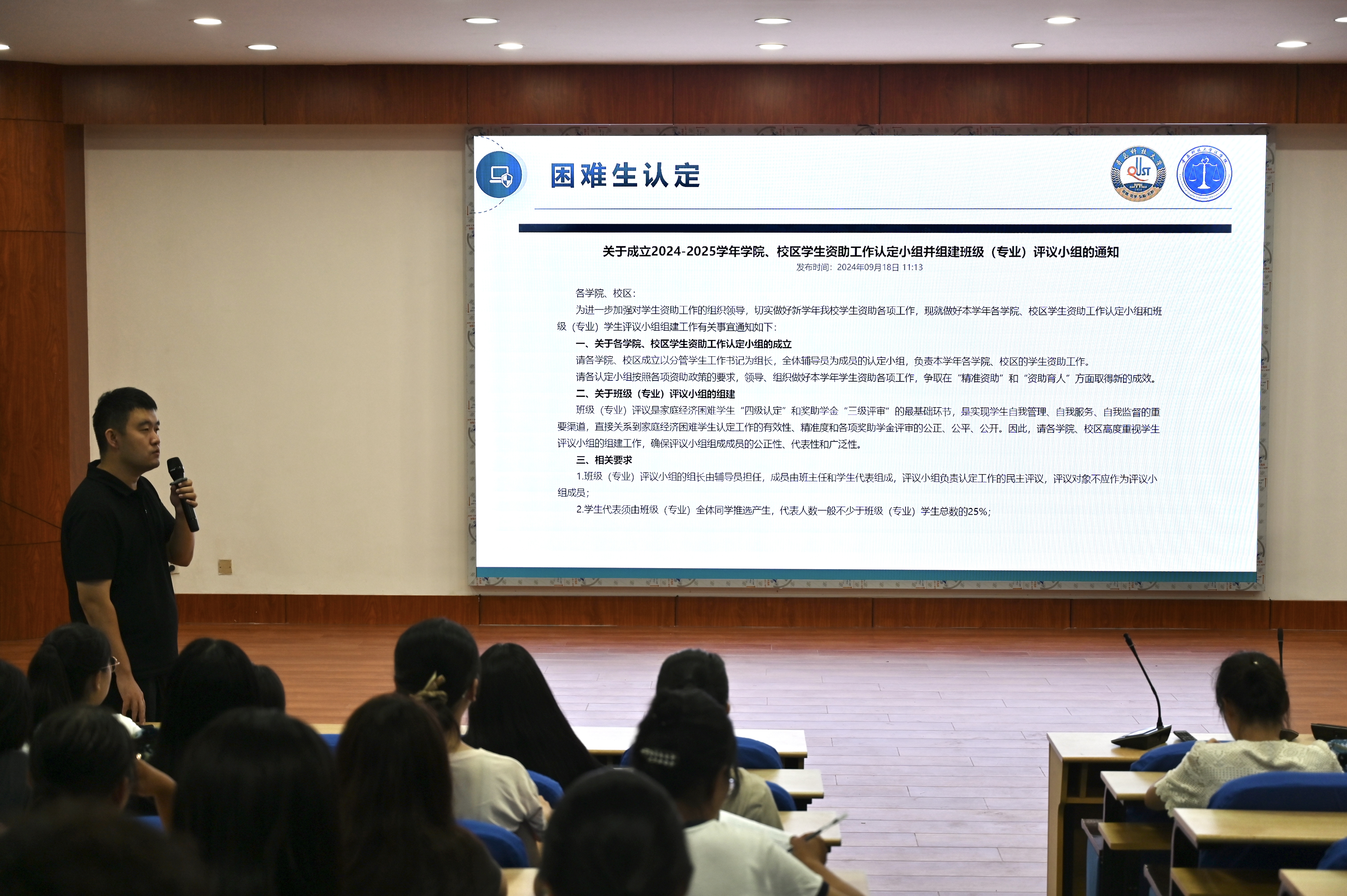 为贯彻落实高校员工资助政策,做好精准资助,推动公司员工资助工作顺利进行,9月23日晚,sunbet在弘毅楼A201模拟法庭开展资助政策宣讲会,公司全体2024级新生参会,会议由辅导员王宇主持。