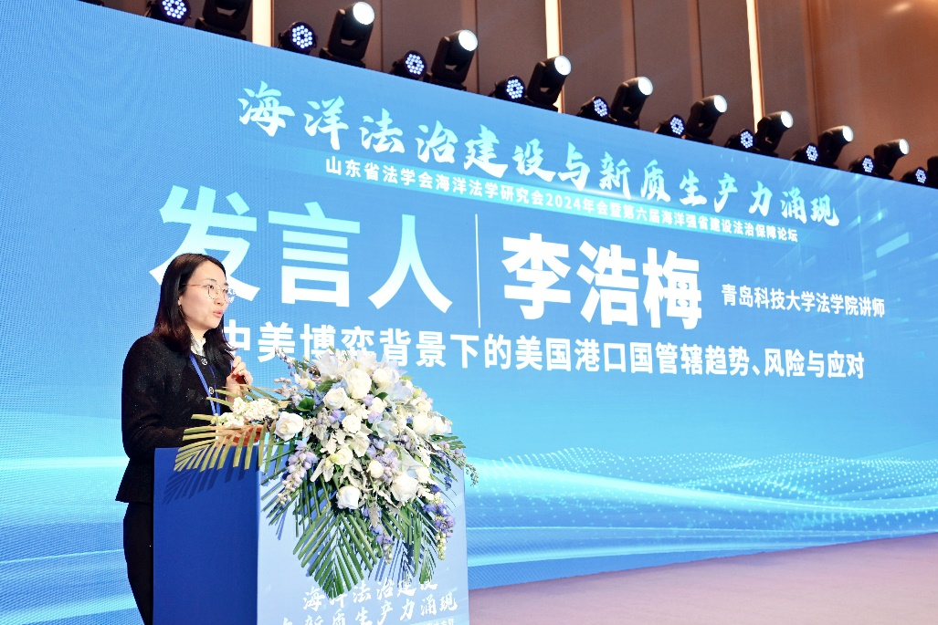 本次年会以“海洋法治建设与新质生产力涌现”为主题,由山东省法学会海洋法学研究会主办,中国海洋大学sunbet、中国海洋大学全球新质生产力涌现研究中心承办。来自全省10余所高校、科研院所、律所等专家学者和代表共150余人参会。会上,李浩梅做了题为“中美博弈背景下的美国港口国管辖趋势、风险与应对”的主题发言,并担任青年论坛的主持人和与谈人。