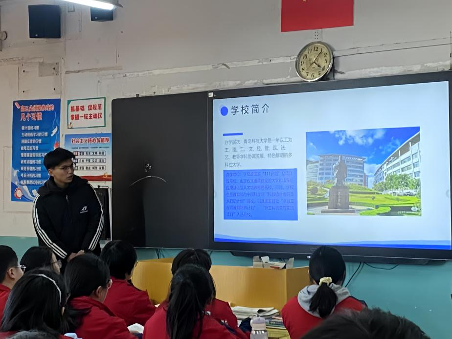 此次活动吸引了山东省莱州一中、潍坊中学、乐陵一中、内蒙古巴彦淖尔市临河区第一中学等六所中学的200余名高三员工集中参会学习。实践团队成员通过形式多样,内容丰富的宣讲活动向学弟学妹们展示着各自高校的校园风貌、学科特色、团队力量以及丰富多彩的校园生活,并结合自身的专业学习,深入浅出地讲解专业课程设置、未来就业方向和发展前景,以此来帮助同学们更好地规划和选择未来的发展道路。团队成员孙溶璐介绍道:“宣讲时回到母校,既是对青春成长的回望,也是对学弟学妹的帮助。”