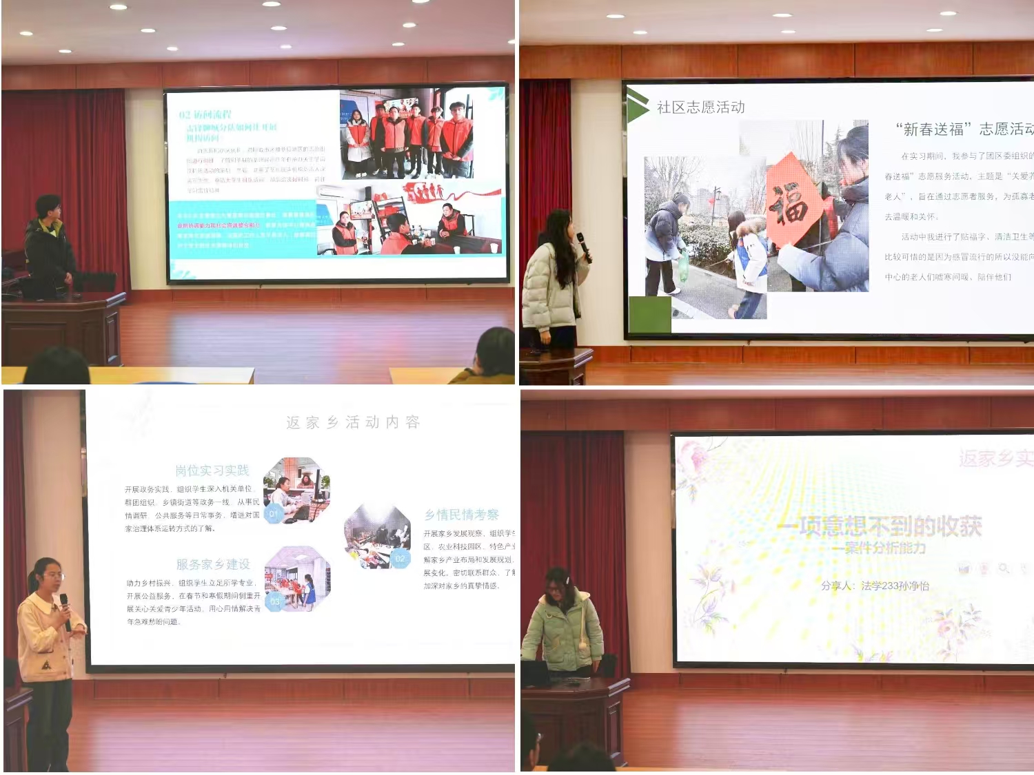 各实践团队从实践背景、实践内容、实践过程等多个方面,采取PPT、视频等方式展开分享。同学们通过生动的案例、翔实的数据和深刻的感悟,展示了他们在实践过程中的所见、所思、所感。在本次社会实践中,sunbet青年员工将专业知识与社会实践深度结合,聚焦乡村振兴、基层服务、法律宣传等重点领域,充分发挥自身专业优势,积极开展法律知识普及、社会调研、法院实习等一系列丰富且扎实的实践活动。