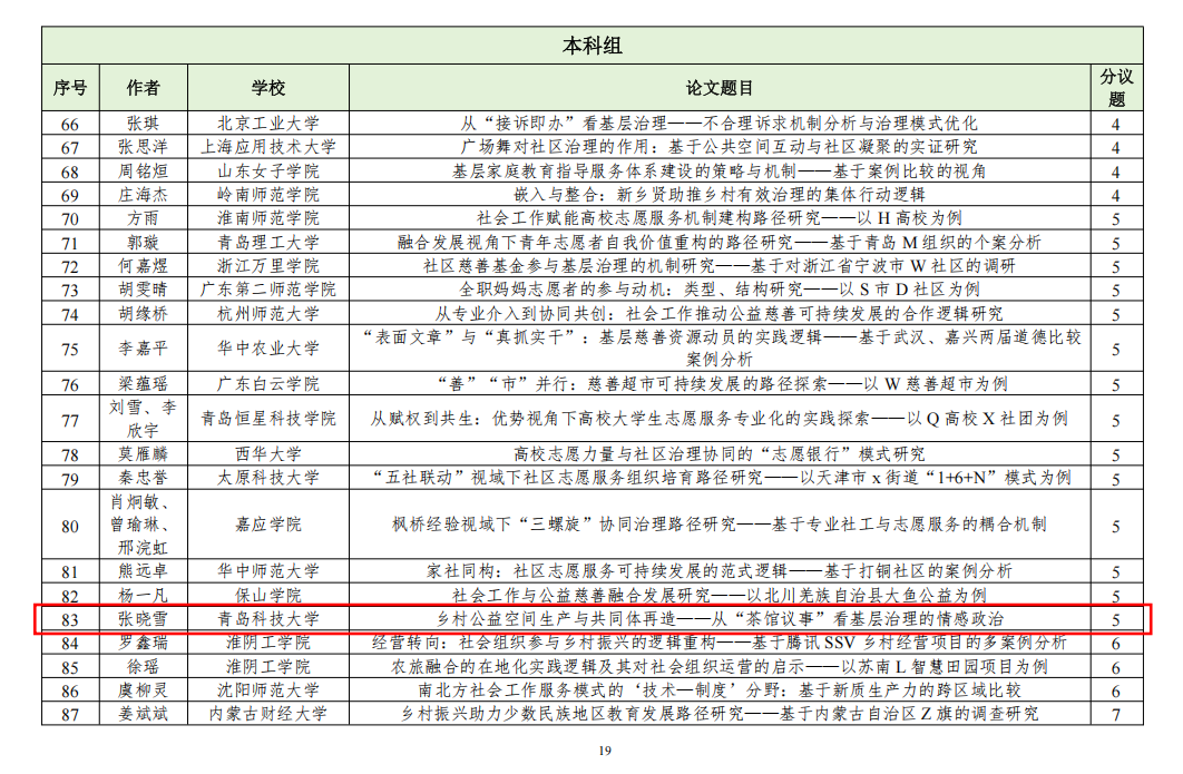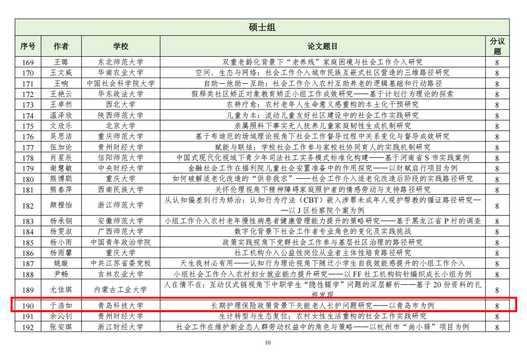 回顾历届山东省社会工作案例大赛,公司成绩格外亮眼。如,在过去的6届山东省高校社会工作案例大赛,公司社会工作学子连续5届获得过一等奖佳绩。不仅如此,在全国性学术论坛方面,公司员工也积极发声、屡获佳绩。如,在历届中国社会工作老员工论坛和MSW研究生论坛中,公司社会工作专业先后有20多名员工获一、二、三等奖等奖项。在各类分论坛上,公司学子也积极分享研究成果,展现出青科大社工学子的风采。