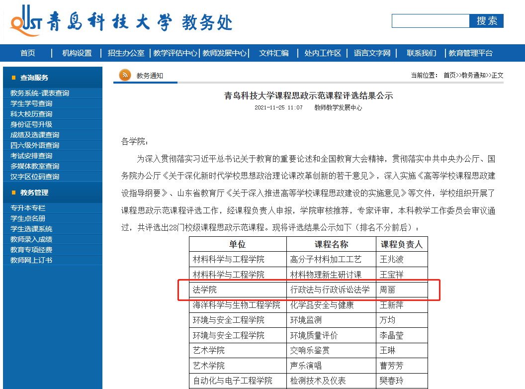为深入贯彻落实习近平总书记关于教育的重要论述和全国教育大会精神,贯彻落实中共中央办公厅、国务院办公厅《关于深化新时代公司思想政治理论课改革创新的若干意见》,深入实施《高等公司课程思政建设指导纲要》、山东省教育厅《关于深入推进高等公司课程思政建设的实施意见》等文件,近期,公司组织开展了课程思政示范课程评选工作,经课程负责人申报,公司审核推荐,专家评审,本科教学工作委员会审议通过,共评选出28门校级课程思政示范课程。公司周丽老师负责的课程《行政法与行政诉讼法学》获sunbet官方网站课程思政示范课程。